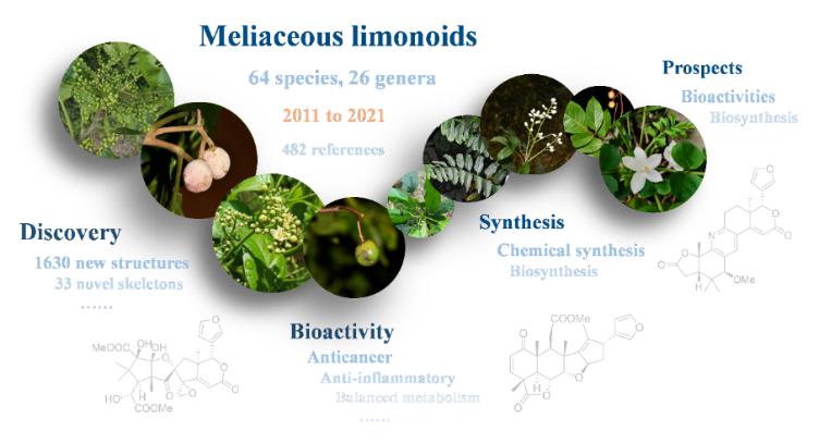 孔令義教授團(tuán)隊(duì)致力于中藥和天然藥物中結(jié)構(gòu)新穎的活性化合物的發(fā)現(xiàn)和研究,已發(fā)現(xiàn)新化合物2000余個(gè),34個(gè)化合物被Nat. Prod. Rep.雜志評(píng)為國(guó)際熱點(diǎn)化合物“Hot off The Press”,其中楝科檸檬苦素是重要的研究方向之一。自2009年以來,本團(tuán)隊(duì)已經(jīng)完成了楝科11屬19種藥用植物中檸檬苦素成分的研究工作,已在Org. Lett.,Acta Pharm. Sin. B, J. Nat. Prod.,J. Org. Chem., Org. Chem. Front.,Chin. Chem. Lett.,Ind. Crop. Prod., Phytomedicine, Phytochemistry, Tetrahedron 等天然產(chǎn)物研究領(lǐng)域國(guó)際權(quán)威和著名期刊發(fā)表包括12種新骨架在內(nèi)的542個(gè)新檸檬苦素類化合物,約占同期全球發(fā)表新檸檬苦素分子總數(shù)的1/3。上述數(shù)據(jù)說明孔令義教授團(tuán)隊(duì)成為了楝科檸檬苦素研究領(lǐng)域國(guó)際上最活躍和知名的課題組之一,因此受Nat. Prod. Rep.雜志主編Tobias Gulder教授的邀請(qǐng),撰寫楝科檸檬苦素研究進(jìn)展的綜述。