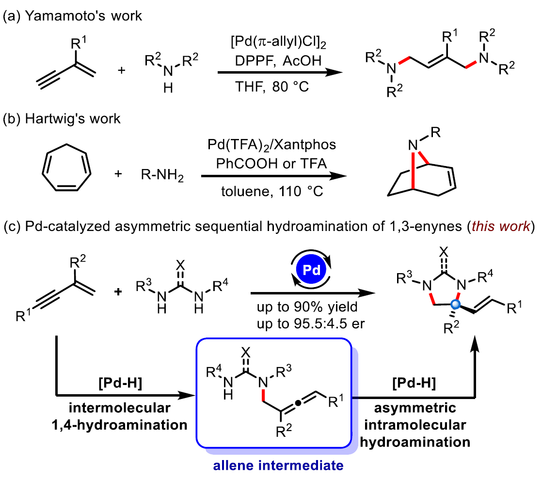 過渡金屬催化不飽和鍵直接氫胺化可以高效構(gòu)建手性含氮類化合物,具有原子經(jīng)濟(jì)性和步驟經(jīng)濟(jì)性等優(yōu)點(diǎn)。不飽和鍵連續(xù)氫胺化反應(yīng),即同時(shí)構(gòu)建兩根碳氮(C-N)鍵的研究報(bào)道較少(圖一,a 和b),尤其是不對(duì)稱催化連續(xù)氫胺化反應(yīng)至今仍沒有被報(bào)道。該類反應(yīng)的關(guān)鍵挑戰(zhàn)在于需要確定一個(gè)高效的催化系統(tǒng),可以完成兩個(gè)連續(xù)但不同的氫胺化過程。此外,為了獲得理想的連續(xù)氫胺化產(chǎn)物,催化劑需要在每個(gè)步驟中表現(xiàn)出較高的區(qū)域選擇性、化學(xué)選擇性和立體選擇性。近日,姚和權(quán)/林愛俊團(tuán)隊(duì)針對(duì)以上問題,設(shè)計(jì)開發(fā)了一類鈀催化共軛烯炔連續(xù)氫胺化反應(yīng),這一氧化還原中性策略為咪唑啉酮和噻唑啉酮等骨架的制備提供了高效合成途徑(圖一,c)。此外,課題組還成功實(shí)現(xiàn)了該類反應(yīng)的不對(duì)稱催化合成,構(gòu)建了一系列手性咪唑啉酮類化合物。作者對(duì)反應(yīng)過程及機(jī)理進(jìn)行詳細(xì)深入的探究,證實(shí)該反應(yīng)首先經(jīng)歷鈀催化分子間氫胺化過程形成聯(lián)烯中間體。隨后,鈀催化聯(lián)烯中間體分子內(nèi)氫胺化,該過程遵循Curtin-Hammett原理,提供對(duì)映體富集的咪唑啉酮產(chǎn)物。