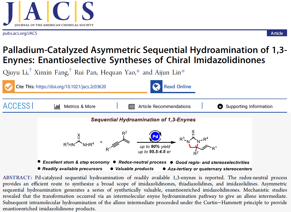 6月10日,著名期刊《Journal of the American Chemical Society》(IF:15.419)在線發(fā)表了我校藥學(xué)院林愛俊/姚和權(quán)團(tuán)隊(duì)題為“Palladium-Catalyzed Asymmetric Sequential Hydroamination of 1,3-Enynes: Enantioselective Syntheses of Chiral Imidazolidinones”最新科研成果。2020級(jí)博士研究生李秋雨和2017級(jí)已畢業(yè)博士研究生方新新為本論文的共同第一作者,姚和權(quán)教授和林愛俊教授為本文的共同通訊作者,中國(guó)藥科大學(xué)為本文的唯一通訊單位。