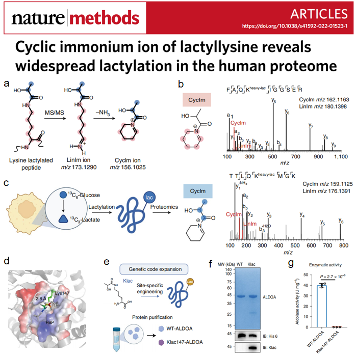 2022年6月27日,Nature Methods期刊在線發(fā)表了我校郝海平/葉慧團(tuán)隊(duì)的最新研究工作成果(Cyclic immonium ion of lactyllysine reveals widespread lactylation in the human proteome)。2019級博士研究生皖寧和2018級碩士研究生王念為本論文的共同第一作者,我校葉慧特聘研究員、郝海平教授和南京中醫(yī)藥大學(xué)王南溪教授為本文的共同通訊作者,中國藥科大學(xué)為本文的第一通訊單位。該工作的主要合作者包括王廣基院士、邵暢博士和余思琴、張漢卿、王德祥、陸文捷、孔影、王鑫淼、呂浪浪等;我校藥科院江蘇省藥物代謝動(dòng)力學(xué)重點(diǎn)實(shí)驗(yàn)室對該工作的開展給予了大力支持。