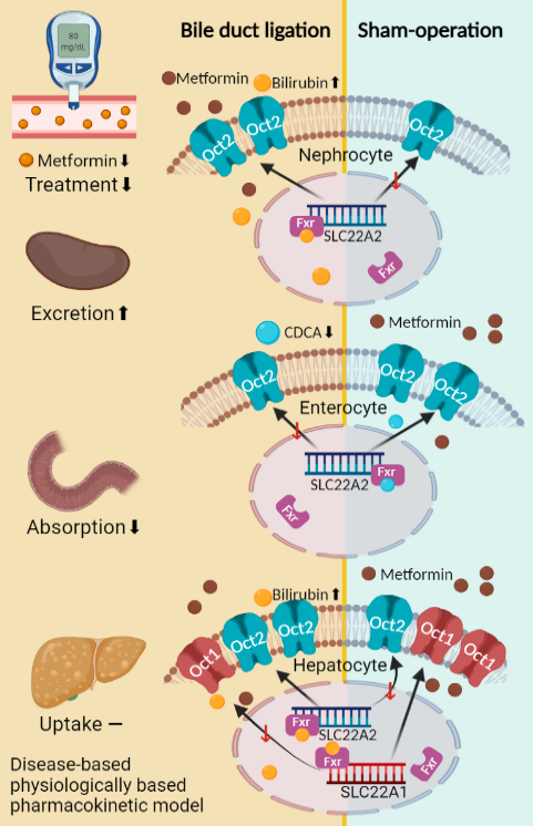肝損傷是臨床上常見的嚴重危害人類健康的疾病。劉曉東/劉李團隊首次報道肝損傷引起OCTs功能和表達的組織和種類差異性改變,顯著降低腸OCT2、肝OCT1蛋白表達,而增加腎和肝OCT2蛋白表達。這種肝損傷狀態下腸、肝和腎OCTs功能與表達差異性改變與體內膽酸鹽和膽紅素水平紊亂有關;腸OCT2表達下調與腸內CDCA等膽酸鹽水平降低有關,而腎和肝OCT2表達增加以及肝OCT1表達降低與膽紅素水平升高有關。膽紅素和CDCA均通過FXR通路調節OCTs 表達。肝損傷狀態下OCTs功能和表達的組織差異性改變顯著降低其底物藥物二甲雙胍的血藥濃度和體內暴露,同時也使其降糖作用顯著降低。OCTs除了參與陽離子藥物如二甲雙胍和西咪替丁等轉運,還參與硫胺素體內轉運。肝損傷通過下調腸OCT2表達,降低硫胺素腸吸收,增加腎OCT2表達,促進硫胺素腎排泄,共同導致體內硫胺素缺乏癥狀。