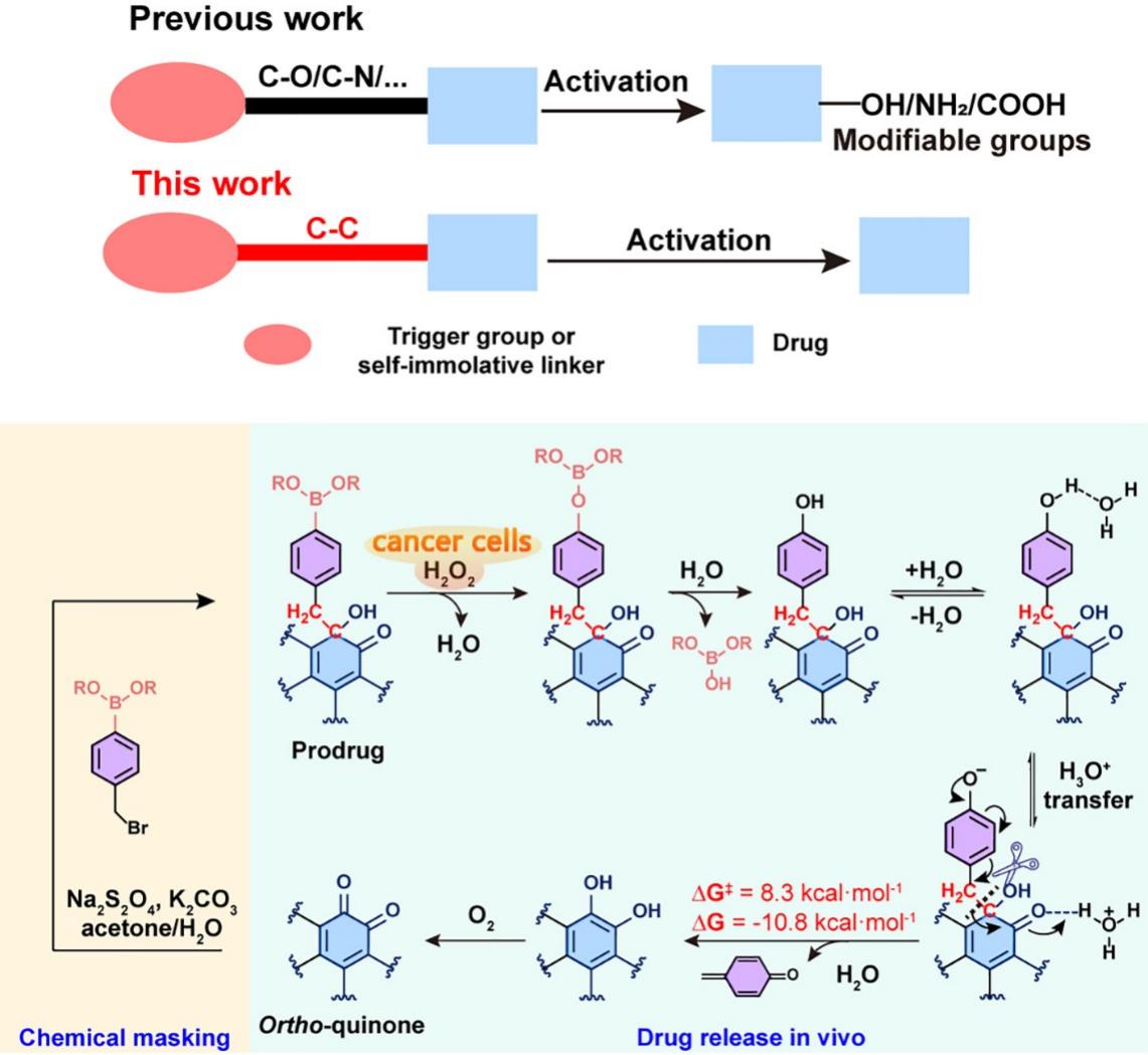 本研究發展了一種基于“C-C鍵”斷裂的前藥設計策略:通過“C-C鍵”化學修飾來穩定屏蔽“鄰醌”活性基團,設計合成獲得α-羥基酮結構的前藥分子;該前藥分子還含有苯硼酸結構的ROS響應基團,可在腫瘤組織高水平ROS觸發下,通過基于1,6-消除的“C-C鍵”斷裂及快速氧化級聯過程,選擇性在腫瘤組織中釋放鄰醌類抗腫瘤藥物。密度泛函理論(DFT)計算表明,關鍵的C-C鍵斷裂釋藥步驟的活化能僅為8.3 kcal/mol,可在生理條件下快速釋藥,其驅動力可能源自產物的芳構化效應。作者將該前藥策略應用于多個鄰醌類抗腫瘤天然產物,代表性的β-lap前藥分子具有良好體內抗胰腺癌藥效,且在810 mg/kg劑量下對正常組織無明顯毒副作用,安全性顯著優于原藥(LD50 = 115.8 mg/kg)。該研究發展的基于C-C鍵斷裂的前藥策略,為鄰醌類藥物的前藥設計、改善安全性等提供了新方法與新思路。