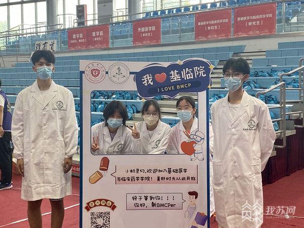 完成報到手續后,新生陸禹銘迫不及待地試穿了他領取到的“白衣戰袍“,在報到處的”打卡點“與同學合影留念。他說,未來一定要加倍努力學習,為祖國的醫藥事業貢獻自己的青春力量。
