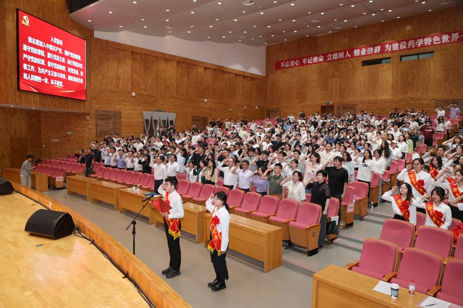活動最后,由2025屆藥學專業本科畢業生呂展墨領誓,2025屆藥事管理專業本科畢業生張佳怡監誓,全體與會黨員重溫入黨誓詞。
