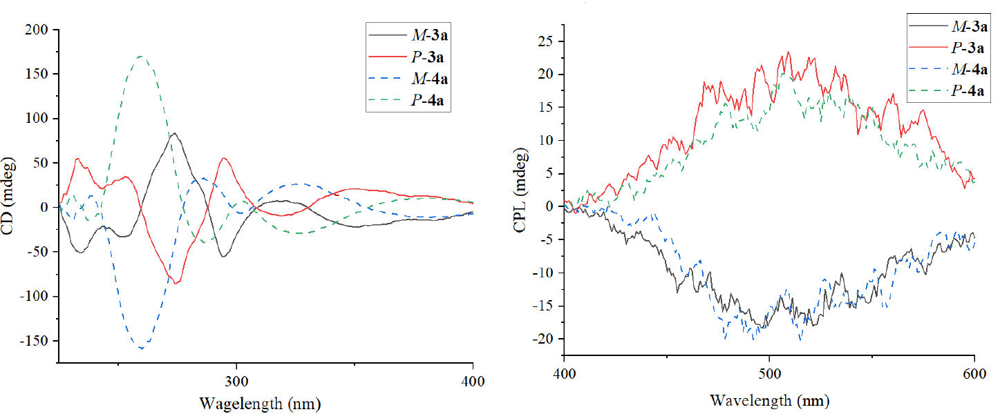 為解決上述難題,團隊在前期工作基礎(chǔ)上(Angew Chem Int Ed,2022,61, e202212005;Chem Sci, 2025, 16, 7876),利用氮雜環(huán)卡賓有機小分子催化的不對稱(3+3)環(huán)化策略從頭構(gòu)建了吡喃-2-酮稠合[5]螺烯和[4]螺烯類化合物(Figure 1)。消旋化實驗表明該類氧雜螺烯骨架具有很高的構(gòu)型穩(wěn)定性,易于實現(xiàn)后期官能團化和修飾。所合成的光學純吡喃-2-酮稠合螺烯分子具有良好的光學物理性質(zhì)和手性光學性質(zhì)(Figure 2),在材料化學等領(lǐng)域具有潛在的應(yīng)用價值。該方法不僅為不對稱合成具有潛在應(yīng)用價值的氧雜螺烯骨架提供了全新策略,也為有機催化不對稱合成雜螺烯分子提供了新思路。