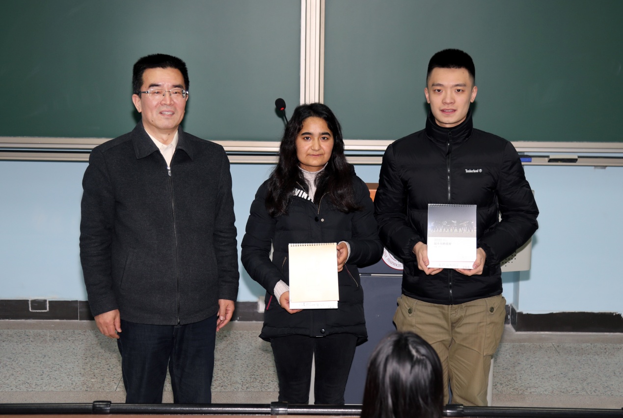 隨后,金書記向班上的兩位同學代表贈送自制的新年禮物——精美的臺歷,一位是班長、退伍軍人葉雨昕同學,一位是維吾爾族同學麥熱米尼薩·哈木提。臺歷印有半年多來金書記與同學們點點滴滴的美好回憶,還附有金書記親筆書寫的新年祝福。同學們備受鼓舞,異口同聲祝金書記新春快樂,并表示將在新的一年加倍努力,銳意進取,以進步和成績回報書記的關心和幫助。