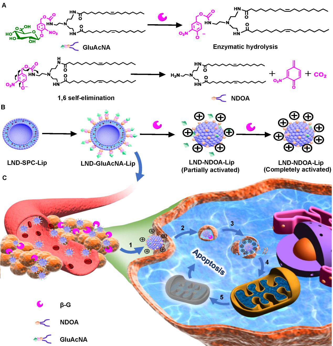 對于目前的抗腫瘤納米藥物來說,如何實現(xiàn)體內(nèi)長循環(huán)、腫瘤部位高效富集、被腫瘤細(xì)胞有效攝取并特異性靶向線粒體是其面臨的主要挑戰(zhàn)。基于上述問題,研究人員巧妙的利用腫瘤病理特點(diǎn),針對腫瘤細(xì)胞外和溶酶體內(nèi)高表達(dá)的β-葡萄糖醛酸酶(β-Glucuronidase, β-G),設(shè)計了基于β-G可序貫式活化、逐級靶向腫瘤細(xì)胞線粒體的藥物遞送系統(tǒng)。采用β-葡萄糖醛酸修飾多胺脂質(zhì),氯尼達(dá)明為抗腫瘤代謝藥物,制備成β-葡萄糖醛酸修飾的脂質(zhì)體。β-葡萄糖醛酸修飾的脂質(zhì)體可顯著提高氯尼達(dá)明在大鼠體內(nèi)循環(huán)時間,增加腫瘤組織藥物蓄積。在腫瘤組織高表達(dá)的β-G活化下,增加腫瘤細(xì)胞對脂質(zhì)體的攝取,觸發(fā)溶酶體逃逸,電荷驅(qū)動進(jìn)入線粒體內(nèi),釋放氯尼達(dá)明,干擾腫瘤細(xì)胞氧化磷酸化,顯著降低胞內(nèi)ATP水平,引起線粒體代謝功能紊亂,誘導(dǎo)腫瘤細(xì)胞凋亡,有效地抑制了小鼠乳腺癌增殖與肺部轉(zhuǎn)移,該遞送系統(tǒng)對靶向腫瘤代謝治療納米藥物設(shè)計提供了新的思路。