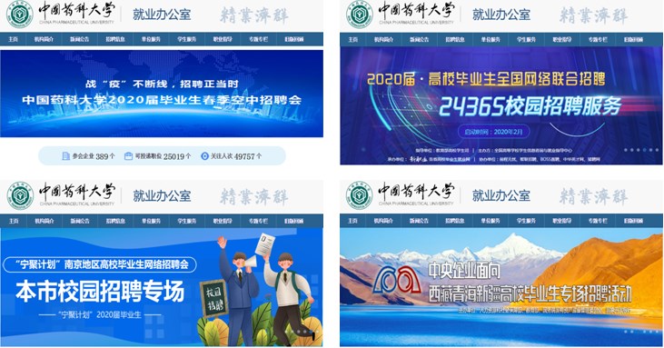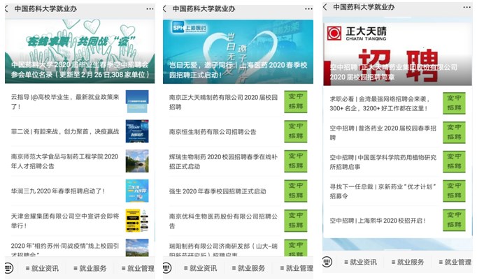 打好線上招聘先手仗,學校主動對接重點地區人社部門和重點醫藥單位依托智慧就業平臺積極開展線上招聘,在國內高校中較早舉辦畢業生春季空中招聘會,參加教育部“2020屆高校畢業生全國網絡聯合招聘——24365校園招聘服務”活動,為畢業生提供每天24小時全年365天的網上校園招聘服務。截至目前,參會單位已近389家,提供就業職位近25000余個,畢業生關注近50000余人次。打贏網絡求職“信息戰”,學校加大就業資訊的搜集發布力度,配合用人單位開展線上招聘活動,在網站開設招聘專區,第一時間將招聘信息通過就業網、“中國藥科大學就業辦”微信公眾號、“藥就業”APP等渠道精準傳達給畢業生。