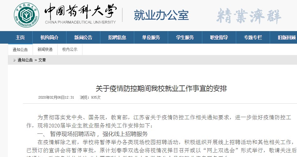 貼心管理先行,我校就業部門工作人員2月中旬即轉入網絡上班狀態,先后通過就業網、微信公眾號等渠道以《中國藥科大學致用人單位的一封信》《中國藥科大學致2020屆畢業生的一封信》《關于疫情防控期間我校就業工作事宜的安排》的形式告知學院就業工作人員、用人單位及應往屆畢業生相關工作安排,確保疫情期間工作不脫線。暖心管理到位,學校開通了報到證打印、就業材料審核等不見面辦理業務,通過網絡審批、快遞郵寄等方式,讓信息多跑路,人員少流動,保障師生人身安全。