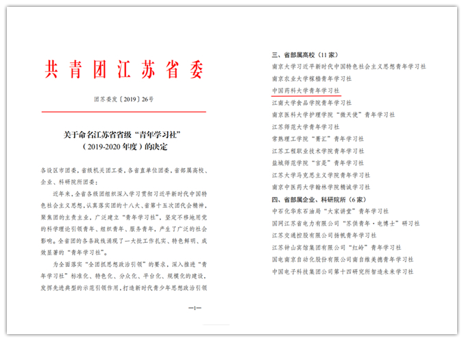 為深入貫徹學習習近平新時代中國特色社會主義思想,積極響應共青團江蘇省委要求,我校于2018年10月成立“中國藥科大學青年學習社”,在全校范圍內掀起“青年大學習”熱潮。
