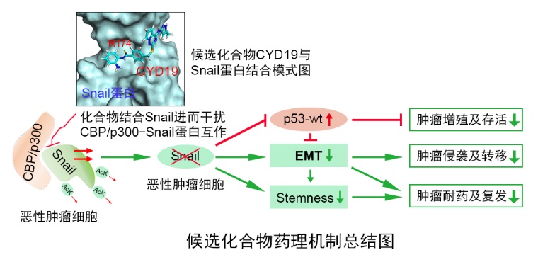 團隊前期研究表明,上皮-間質轉化(EMT)相關轉錄因子Snail在多種惡性腫瘤組織中異常高表達,其表達水平與攜帶野生型p53病人的腫瘤進程和不良預后正相關;敲除Snail基因通過上調野生型p53信號通路抑制腫瘤發生、發展及轉移。傳統上,Snail被認為是“不可藥性”靶點,而直接靶向Snail蛋白小分子抑制劑迄今未見任何報道?;诖耍?/span>團隊開展了基于Snail 晶體結構的化合物設計、合成和篩選工作,并最終獲得候選化合物CYD19。研究發現,CYD19與Snail 蛋白進化上保守的174 位精氨酸高效結合,在幾十納摩水平即可顯著抑制多個腫瘤細胞系Snail 蛋白表達,其機制是化合物與Snail 蛋白結合后干擾乙酰轉移酶CBP/p300與Snail 結合,導致后者失去乙?;Wo而被泛素化降解。進一步的研究發現,CYD19通過抑制Snail┨p53信號軸而遏制腫瘤細胞體內外生長、通過抑制Snail介導的EMT 進程而遏制細胞侵襲及遠處轉移(見下圖)。CYD19作為全新結構CBP/p300-Snail 蛋白互作抑制劑,是首個報道的直接靶向Snail 蛋白小分子候選化合物。該首創(first-in-class)化合物的發現更正了傳統上認為Snail 是“不可成藥”的靶點的認識,將為轉移性腫瘤(特別是表達野生型p53 腫瘤)治療提供新選擇,具有重要的基礎和社會意義。