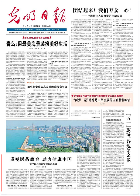 今天(4月29日)出版的《光明日報》在頭版刊登《重視醫(yī)藥教育 助力健康中國——訪中國藥科大學校長來茂德》專訪我校校長來茂德。
