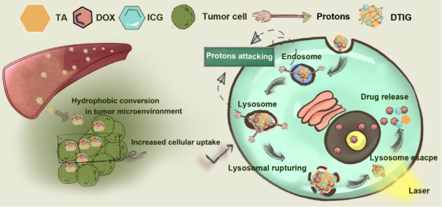 納米藥物遞送系統通過提高藥物遞送效率可以改善腫瘤藥物的治療效率。然而,網狀內皮系統的清除、腫瘤組織深層滲透困難、腫瘤細胞攝取效率較低、溶酶體中的藥物失活以及釋藥遲滯等體內遞藥屏障或技術壁壘仍然制約著納米藥物的發展。根據木桶定律,納米藥物在穿越上述屏障的任一環節受阻均會降低藥物的總體遞送效率,從而削弱藥物的最終治療效果。盡管腫瘤微環境響應型的納米藥物遞送系統,可以通過多次轉換其親疏水性或者尺寸大小以逐層貫穿這些遞藥屏障,然而以往藥物遞送系統的構建往往需要依賴于結構復雜且未經FDA批準的新型合成生物材料。此外,其所含敏感鍵多依賴于化學或者生物反應的完全發生。因此,這些遞藥系統產業轉化技術壁壘大且敏感型轉換效率仍然受限。為解決上述問題,姚靜教授團隊受蛋白質變性和復性的啟發,開發了一種具有質子觸發的親疏水-尺寸轉換特性及光熱療法(PT)介導的腫瘤深部遞送效應的瞬時轉換納米組裝體。該瞬時轉換納米組裝體的構建,僅需以FDA批準的藥物阿霉素,單寧酸和吲哚菁綠為構建單元,經π-π相互作用及靜電作用組裝為DTIG納米轉換體。研究表明,DTIG納米轉換體在血液循環的中性環境下為親水性且具有良好的穩定性,而在腫瘤微環境(pH6.5)及酸性溶酶體內(pH4.5)由于質子的觸發可瞬時轉換為疏水性大尺寸納米顆粒,在DTIG納米轉換體撕裂溶酶體膜發生逃逸后進入細胞質環境時可再次快速恢復親水性小尺寸特性,從而達到連續貫穿遞藥生物屏障的效果。該DTIG納米組裝體結合激光治療具有良好的化療與PT聯合治療效果以及腫瘤深層藥物滲透效應,且可以有效改善預后。本研究為開發納米藥物提供了一種程序化地突破不同的腫瘤靶向藥物遞送屏障的新策略。