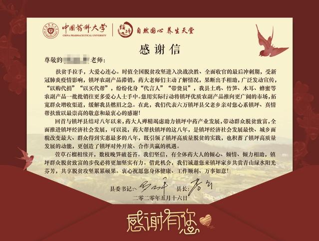 近日,鎮坪縣委縣政府為每一位參與消費扶貧教職員工寄來感謝信,信中鎮坪縣委書記羅萬平、縣長李平代表六萬鎮坪縣父老鄉親對我校教職員工心系鎮坪、真情幫扶致以最崇高的敬意和最衷心的感謝。信中說,藥大幫扶鎮坪的八年,是鎮坪經濟社會發展最快、城鄉面貌改變最大、群眾得到實惠最多的八年,既引領了鎮坪高質量脫貧的實踐,也積蓄了鎮坪高質量發展的動能,更創造了鎮坪對外開放、合作共贏的機遇。