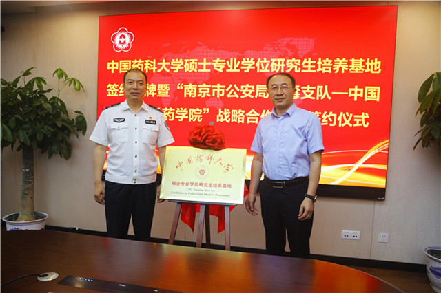 協議書簽署完成后,中國藥科大學副校長陸濤、南京市公安局黨委委員曹存福共同為“中國藥科大學碩士專業學位研究生培養基地”揭牌。雙方一致希望務實推進本次合作,提升研究生培養的層次,共同為我國禁毒工作的科學發展做出貢獻,承擔維護社會穩定和諧的社會責任。