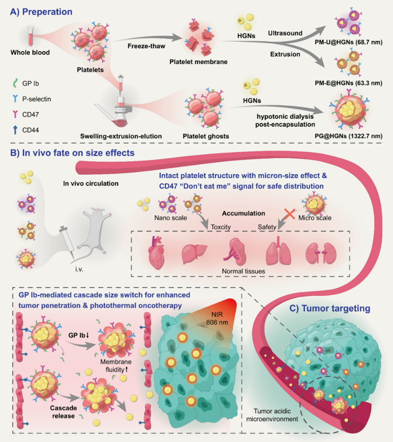 基于對(duì)腫瘤EPR效應(yīng)的關(guān)注,團(tuán)隊(duì)針對(duì)納米尺寸藥物易從血管內(nèi)皮間隙外滲而導(dǎo)致脫靶并在正常組織蓄積的難題,設(shè)計(jì)了微米級(jí)血小板“鬼影”(PGs)載體遞送中空金納米粒(HGNs),構(gòu)建了有較高安全性的微-納級(jí)聯(lián)仿生遞藥系統(tǒng)(PG@HGNs)。相比納米血小板膜包覆載體,PG@HGNs的細(xì)胞攝取和細(xì)胞毒性顯著增強(qiáng)。相關(guān)內(nèi)容以 “Glycoprotein Ib-regulated micro platelet ghost for biosafe distribution and photothermal oncotherapy”為題發(fā)表在Journal of Controlled Release。我校2019級(jí)碩士研究生鄒佳輝為本文第一作者,張文麗副教授、劉建平教授為共同通訊作者,中國藥科大學(xué)為唯一通訊單位。