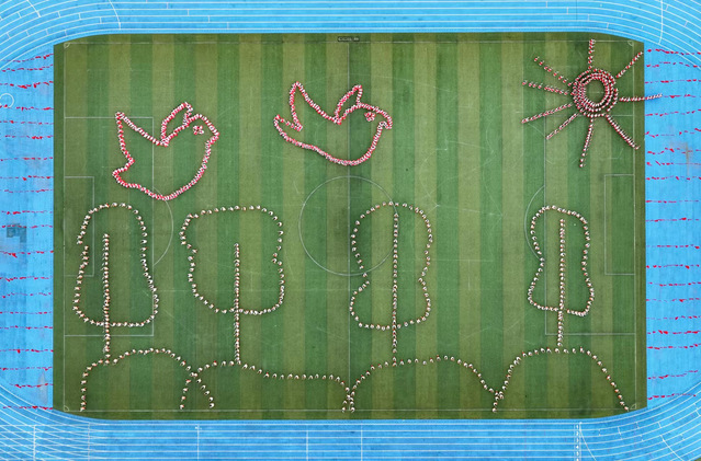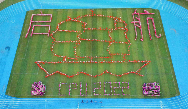 全場的高潮團隊操表演來了!第一篇章《我的祖國》,在抒情悠揚的音樂聲中,藥大學子與時代共舞,硬核表白祖國母親。第二篇章《美麗中國》,同學們圍圈形成了一團團花的形狀,中間托舉的同學們構成了花蕊,展現著內心的昂揚熱情,生動詮釋華夏壯美盡顯中國風韻。由1680名藥大同學以及教職工歌舞協會的老師們帶來了第三篇章《再一次出發》,千名學子震撼拼出“中國巨輪”“CPU 2022”字樣,象征著新一代藥大人將迎著時代之風揚帆起航、鏗鏘前行!