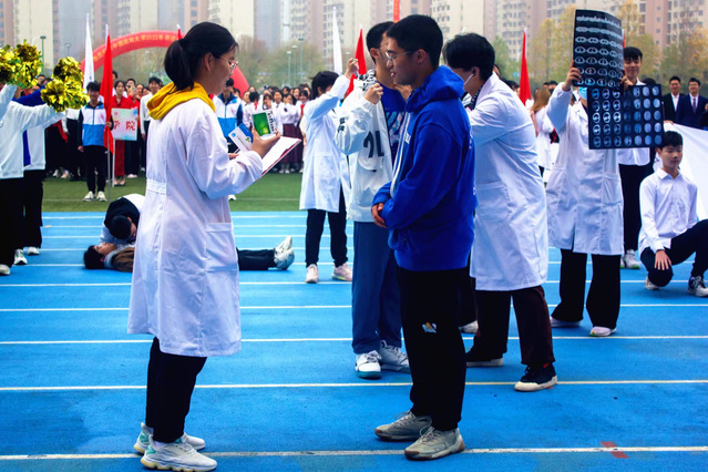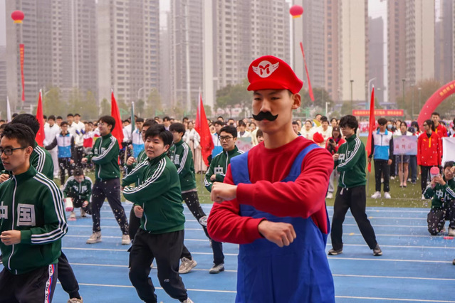 運動會的入場式上來就很精彩!各學院方隊邁著自信矯健的步伐依次進場,整齊的隊列、炫酷的服裝、嘹亮的口號,充分彰顯了藥大師生蓬勃向上的精神風貌。有趣的是,基礎醫學與臨床藥學學院在現場還原了人工心肺復蘇、問診檢查、觀察膠片等醫療場景,與專業巧妙結合,創意滿滿。孟目的學院方隊帶來的則是“超級瑪麗”表演,隊員們擺出經典的磚塊界面,當身穿背帶褲的馬里奧在現場升級打怪時,引來了一波童年回憶殺。外國留學生身著各色服飾,帶來了動感火辣的舞蹈,勁爆全場。富有寓意的造型、風格各異的文體節目表演,動靜結合、形式多樣的各方隊匯演精彩紛呈,將現場氣氛烘托得熱烈喜慶。