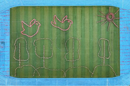 一曲過半,風采續展。千名藥大學生時而分切四角,中央跑圓;時而齊排方陣,對角相望,依序起舞,遙相呼應;時而擬作波浪,來回起落。表演中,變換的隊列展現出華夏大地錦繡河山的如畫如詩,多次出現的同心圓象征著祖國人民的團結美滿,與選曲《美麗中國》主旨完美呼應。