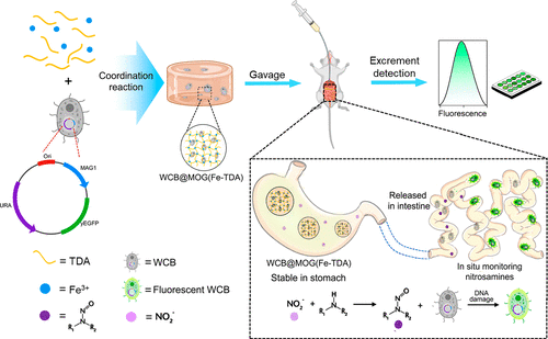亞硝酸鹽是一種廣泛用于肉制品、飲用水、蔬菜和水果的食品添加劑。但過量亞硝酸鹽可以通過胃腸道菌群轉化為亞硝胺,即通過細胞色素P450轉化為α-羥亞硝胺,分解成高活性陽離子或重氮,從而導致DNA烷基化,造成引發癌癥的風險。目前,食品中亞硝胺的檢測主要通過氣相色譜-質譜 (GC-MS)或液相色譜-質譜 (LC-MS)等方法,然而尚缺少原位檢測亞硝胺的方法。因此,為了準確檢測體內產生的亞硝胺,該工作設計了一種金屬有機凝膠 (MOG)保護的細胞生物傳感器 (WCB),即WCB@MOG。為了保護WCB免受胃酸環境的影響,設計了一種由Fe3+和2,2’-硫代二乙酸 (TDA)制備而成的MOG (Fe-TDA)來包封WCB。Fe-TDA具有抗胃酸性,可將WCB輸送到腸道,而不會影響原位檢測亞硝胺的性能。實驗結果表明,WCB@MOG(Fe-TDA)在腸道中釋放出WCB,可以通過測定小鼠排泄物中的WCB熒光信號強度監測腸道中的亞硝胺,最終成功用于研究小鼠體內亞硝酸鹽向亞硝胺的轉化。