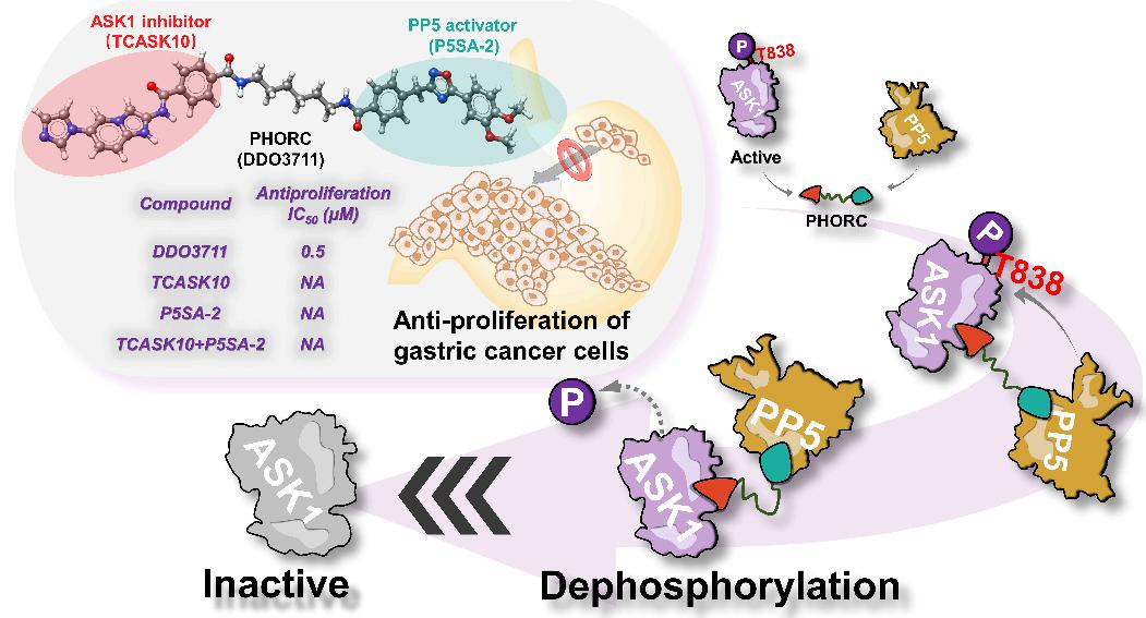 本研究在前期工作基礎上,基于HSP90-CDC37-PP5-Kinases分子伴侶體系特點,設計小分子精確地調控底物蛋白的異常磷酸化。本研究以共伴侶蛋白PP5的磷酸酶功能為基礎,通過將PP5和底物蛋白ASK1的小分子配體通過化學連接鏈相連,發現了PhoRCs磷酸酶募集嵌合體多特異性小分子DDO3711,可特異性將p-ASK1T838去磷酸化,解決了胃癌細胞中因 ASK1 的過度磷酸化而導致的細胞異常增殖問題。DDO3711能夠以直接結合并拉近 ASK1 和 PP5 的方式來促進p-ASK1T838的去磷酸化調控,進而抑制ASK1下游信號通路JNK、p-38的激活以及細胞周期相關蛋白CDK4/6、cyclin D1的表達,最終實現了顯著的抗胃癌細胞增殖效果。以上研究充分利用了共伴侶蛋白PP5的磷酸酶功能,巧妙地設計小分子調控劑將其與過度磷酸化的底物蛋白相連,在不影響底物蛋白表達的同時,實現了對其磷酸化過程的精準調控,為小分子調控蛋白的翻譯后修飾過程提供了重要研究思路與范例。
