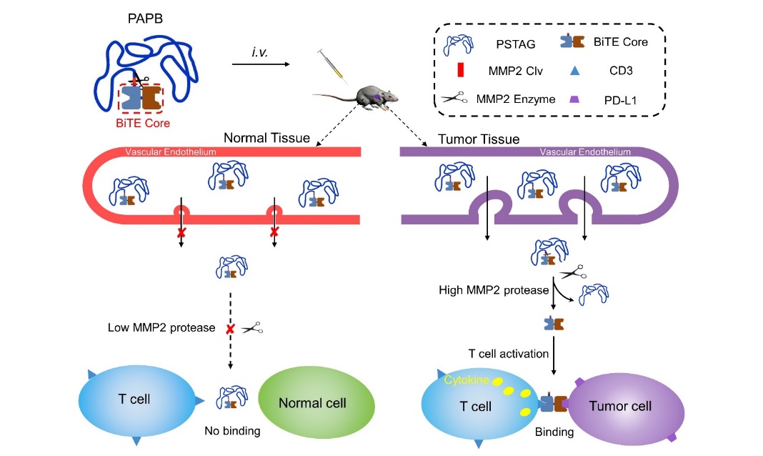 雙特異性T細(xì)胞激活劑(BiTE)抗體可以重定向T細(xì)胞到腫瘤細(xì)胞,并啟動(dòng)靶向溶解腫瘤細(xì)胞。然而,由于血漿半衰期短、“非靶向”效應(yīng)和PD-1/PD-L1軸免疫抑制等問題,在實(shí)體腫瘤中使用BiTE一直具有挑戰(zhàn)性。本團(tuán)隊(duì)設(shè)計(jì)了一種腫瘤微環(huán)境特異性激活的雙特異抗體平臺(tái)PAPB:Protease-Activated PSTAGylated BiTE,其中包括聚多肽(PSTAG)、蛋白酶激活連接器和BiTE核心。BiTE核心由兩個(gè)針對(duì)PD-L1和CD3的scFv組成。相關(guān)內(nèi)容以“Microenvironment-responsive anti-PD-L1 × CD3 bispecific T-cell engager for solid tumor immunotherapy” 為題,長(zhǎng)文形式發(fā)表在Journal of Controlled Release。我校博士后劉定康為本文第一作者,尹駿副研究員和高向東教授為本文共同通訊作者。中國(guó)藥科大學(xué)為本文唯一通訊單位。