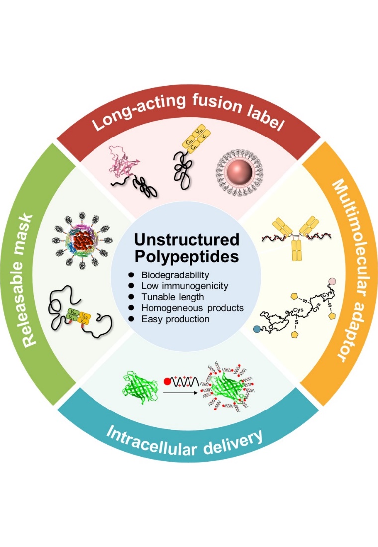 雖然聚乙二醇化(PEGylation)已被廣泛應(yīng)用,但PEG仍具有免疫原性和不可生物降解的問題。為了克服這些問題開發(fā)出多種模擬PEG的聚多肽,其本質(zhì)為蛋白質(zhì),具有長(zhǎng)度可調(diào)節(jié)、生物可降解、免疫原性低、易于生產(chǎn)等特性,是提高生物大分子成藥性的研究熱點(diǎn)之一。本團(tuán)隊(duì)在自主開發(fā)的聚多肽的基礎(chǔ)上系統(tǒng)總結(jié)了聚多肽的發(fā)展、設(shè)計(jì)和生物化學(xué)特性,介紹了其在延長(zhǎng)多肽、蛋白質(zhì)、抗體片段和納米載體半衰期中的應(yīng)用,討論了其作為“隱身”生物聚合物、多分子銜接器和細(xì)胞內(nèi)遞送載體等最新研究成果。相關(guān)內(nèi)容以“Unstructured Polypeptides as a Versatile Drug Delivery Technology”為題,綜述形式發(fā)表在Acta Biomaterialia。我校博士研究生嵇悅、博士后劉定康為本文共同第一作者,尹駿副研究員和高向東教授為本文共同通訊作者。中國(guó)藥科大學(xué)為本文唯一通訊單位。