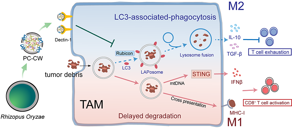 腫瘤免疫治療是近年來迅速發展的突破性腫瘤療法,可顯著提高患者的生存期。傳統細胞毒性療法產生的凋亡腫瘤細胞具有很強的免疫激活潛力,然而,腫瘤相關巨噬細胞(TAMs)介導的胞葬作用可以通過LC3相關吞噬作用(LAP)負向清除凋亡的腫瘤細胞,抵抗潛在的抗腫瘤免疫反應。同時,LAP作用還可刺激TAMs釋放免疫抑制性細胞因子并促進抑制免疫的M2型巨噬細胞轉化,進一步加劇腫瘤微環境的免疫抑制。