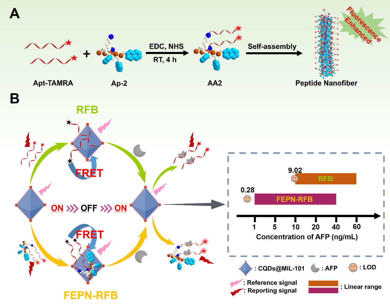 針對(duì)上述問(wèn)題,研究團(tuán)隊(duì)開(kāi)發(fā)了一種基于新型信號(hào)放大策略的比率熒光生物傳感器FEPN-RFB,用于檢測(cè)血清樣本中的腫瘤標(biāo)志物甲胎蛋白(Alpha-fetoprotein, AFP)。研究發(fā)現(xiàn),兩親肽自組裝形成的納米纖維能富集Apt-TAMRA實(shí)現(xiàn)熒光信號(hào)放大,且兩親肽中氨基個(gè)數(shù)是影響信號(hào)放大的關(guān)鍵因素。為了盡量降低背景信號(hào)和系統(tǒng)穩(wěn)定性的影響,研究人員設(shè)計(jì)了具有熒光發(fā)射和猝滅雙特性的CQDs@MIL-101,其展現(xiàn)出優(yōu)異的核酸吸附性能,由于存在熒光共振能量轉(zhuǎn)移現(xiàn)象,可猝滅AA2的熒光。當(dāng)存在目標(biāo)物AFP時(shí),AA2與AFP的強(qiáng)親和力使AA2從CQDs@MIL-101表面脫離,其熒光恢復(fù)。因此,報(bào)告信號(hào)AA2與參比信號(hào)CQDs@MIL-101可形成比率熒光體系,根據(jù)AA2和CQDs@MIL-101的熒光強(qiáng)度可計(jì)算出AFP濃度。該生物傳感器FEPN-RFB檢出限達(dá)到0.28 ng/mL,與未使用新型信號(hào)放大策略相比,檢出限降低了30倍。在真實(shí)血液樣本的AFP檢測(cè)中,F(xiàn)EPN-RFB與臨床上使用的化學(xué)發(fā)光免疫分析法檢測(cè)結(jié)果一致,展現(xiàn)了優(yōu)良的應(yīng)用潛力。該新型信號(hào)放大策略為開(kāi)發(fā)具有高靈敏度的檢測(cè)方法提供了思路。