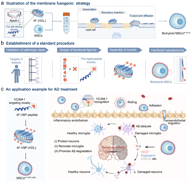 間充質(zhì)干細(xì)胞療法近年取得突破性臨床進(jìn)展,尤其對阿爾茨海默癥(AD)等神經(jīng)退行性疾病治療具有極好的應(yīng)用前景,但病灶非特異性遷移仍是其療效不佳的關(guān)鍵問題。基于上述間充質(zhì)干細(xì)胞治療難點(diǎn),受內(nèi)源活性微粒盤狀高密度脂蛋白(HDL)生物合成和生理功能啟發(fā),本研究創(chuàng)新性提出:通過HDL橋接干細(xì)胞膜表面脂筏,完成間充質(zhì)干細(xì)胞膜表面高效無損病灶靶向歸巢修飾,構(gòu)建膜雜化間充質(zhì)干細(xì)胞傳遞系統(tǒng),實(shí)現(xiàn)了間充質(zhì)干細(xì)胞在AD動物模型中血腦屏障滲透、病灶富集、長效存活和旁觀者效應(yīng)等神經(jīng)修復(fù)治療優(yōu)勢。此外,本研究深入解析間充質(zhì)干細(xì)胞AD治療機(jī)制,發(fā)現(xiàn)入腦間充質(zhì)干細(xì)胞可通過激活神經(jīng)系統(tǒng)發(fā)育及神經(jīng)炎癥抑制等相關(guān)信號通路,實(shí)現(xiàn)AD腦內(nèi)神經(jīng)重塑。本研究設(shè)計(jì)的仿生膜修飾技術(shù)具有高效、穩(wěn)定、溫和等優(yōu)勢,為開發(fā)個性化活細(xì)胞藥物輸送平臺提供了新思路和新方案。