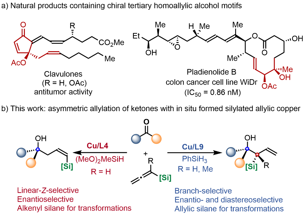 近日,國際著名期刊Angewandte Chemie International Edition(IF:16.6)在線發(fā)表了我校藥學(xué)院姚和權(quán)/高尚團(tuán)隊題為“Copper-Catalyzed Enantioselective and Regiodivergent Allylation of Ketones with Allenylsilanes”最新科研成果。我校2020級碩士研究生徐孟華、2021級碩士研究生路清斌為本論文的共同第一作者,藥學(xué)院姚和權(quán)教授和高尚副研究員為本文的共同通訊作者,中國藥科大學(xué)為本文的唯一通訊單位。