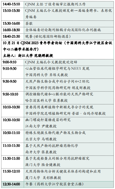 2023年10月19-21日,CJNM期刊將在中國藥科大學江寧校區召開2023年度CJNM全體編委會工作會議暨藥學前沿報告會。屆時將邀請天然藥物領域的院士、杰青、知名專家圍繞天然藥物前沿熱點作精彩報告。會議主題為“聚焦天然藥物前沿熱點,推動學科交叉融合”,熱烈歡迎廣大讀者作者參會。本次會議不收取會務費。會議同期召開2023年度CJNM編委會全體工作會議,誠摯邀請編委會全體委員參加會議。