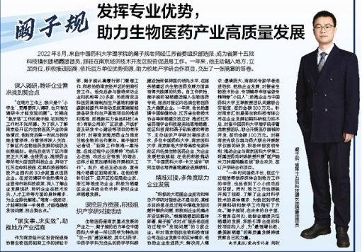2022年8月,來(lái)自中國(guó)藥科大學(xué)理學(xué)院的闞子規(guī)老師經(jīng)江蘇省委組織部選派,成為省第十五批科技鎮(zhèn)長(zhǎng)團(tuán)棲霞團(tuán)團(tuán)員,派駐在南京經(jīng)濟(jì)技術(shù)開(kāi)發(fā)區(qū)投資促進(jìn)局工作。一年來(lái),他主動(dòng)融入地方,立足崗位,積極推進(jìn)招商;依托后方單位優(yōu)勢(shì)資源,助力校地產(chǎn)學(xué)研合作項(xiàng)目,交出了一張滿(mǎn)意的答卷。