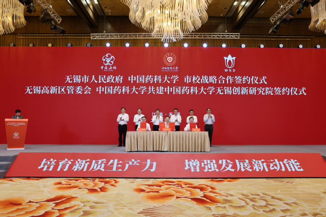10月7日,中國藥科大學與無錫市人民政府正式簽署《無錫市人民政府 中國藥科大學戰略合作協議》,中國藥科大學無錫創新研究院同步簽約。無錫市委書記杜小剛,江蘇省藥品監督管理局局長田豐,中國藥科大學黨委書記金能明、校長郝海平出席簽約儀式。無錫市領導高飛、周文棟、吳建元,中國藥科大學副校長姚和權、齊煉文、楊勇等參加活動。此次合作,不僅是全面推進健康中國戰略的實際行動,也是校地攜手并進、合作共贏的重要舉措。