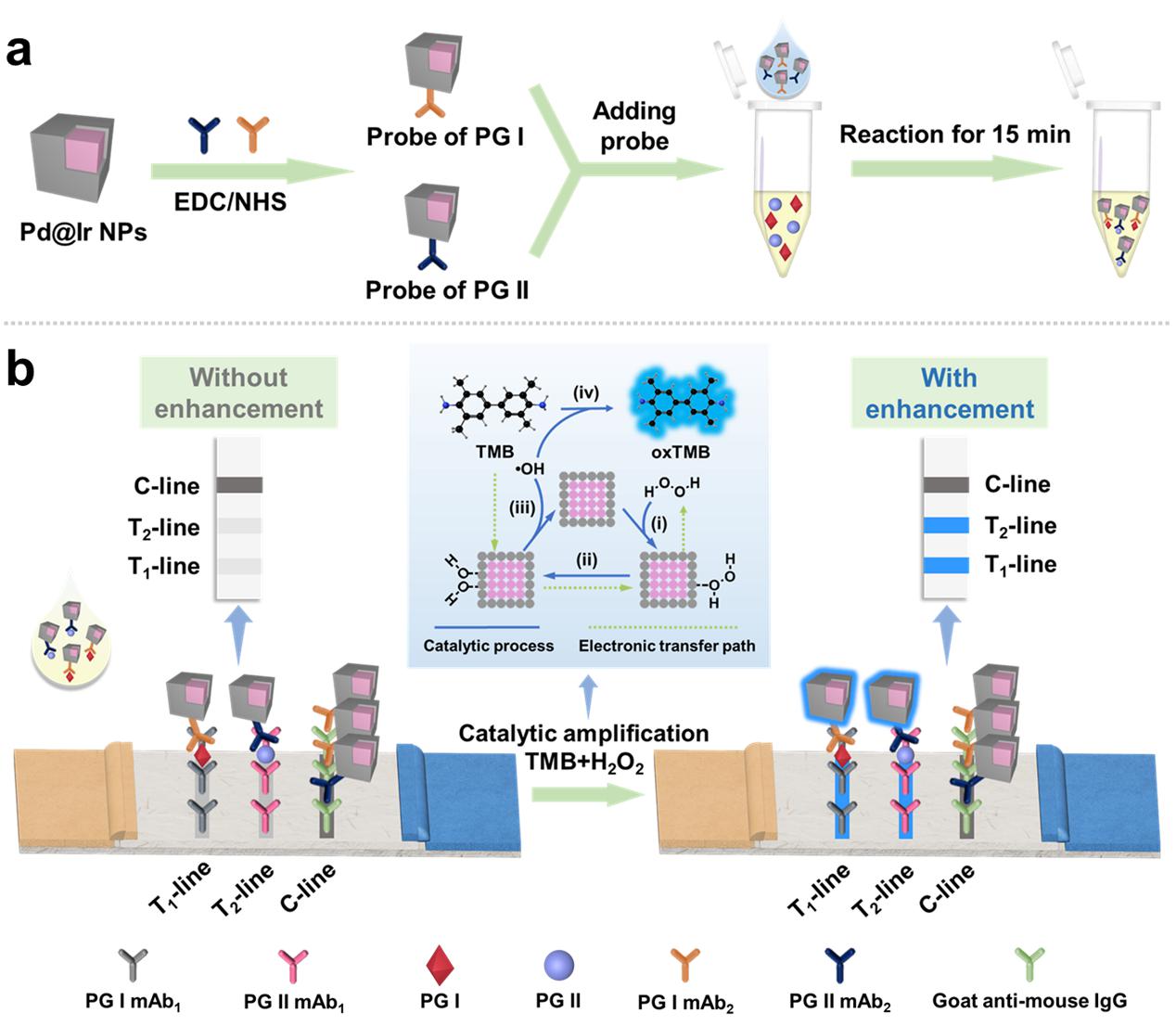 針對上述問題,研究團隊使用了一種比色信號的放大策略,即雙金屬納米酶介導的原位催化報告分子沉積(BN-ISCRD),用于LFIA以實現超靈敏檢測癌癥生物標志物。由于兩種金屬的協同或相加作用,雙金屬納米酶(Pd@Ir NPs)表現出比Pd NPs和Ir NPs更優異的類過氧化物酶活性。基于此,將其作為標記材料應用于LFIA,通過原位催化報告分子沉積,以實現比色信號的放大,提高檢測靈敏度。將該方法應用于檢測胃癌標志物(PG I和PG II),信號放大后裸眼檢測限可達10 pg/mL,靈敏度提供了200倍;同時,成功地從36個臨床血清樣本中鑒別出8個胃癌陽性樣本,與臨床方法的檢測結果一致。這種BN-ISCRD策略將新型納米材料與生物傳感技術結合,為構建超靈敏的即時檢測平臺提供了一種新方法。