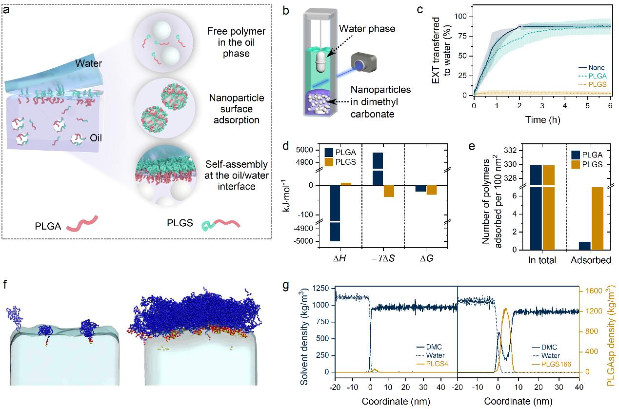 該團(tuán)隊運(yùn)用石英晶體微天平、自主研發(fā)的藥物跨界面擴(kuò)散實時監(jiān)測裝置等實驗手段,結(jié)合全原子和粗粒化的分子動力學(xué)模擬,對兩親性聚合物抑制藥物膠體顆粒相轉(zhuǎn)移的作用機(jī)制進(jìn)行了多層次分析。研究結(jié)果顯示,具有高表面活性的兩親性聚合物不僅能在藥物膠體顆粒表面形成穩(wěn)定的吸附層,還能快速在油水界面自組裝成致密的界面膜。這兩種由聚合物形成的界面結(jié)構(gòu)共同阻擋了藥物膠體顆粒接近油水界面,從而有效抑制了其相轉(zhuǎn)移過程。通過對兩親性聚合物在整個體系中分布狀態(tài)的分析,確認(rèn)了游離狀態(tài)是兩親性聚合物在油相中的主要存在形式。這一機(jī)制在不同種類的聚合物材料及藥物組成中都展現(xiàn)出了較高的通用性。該研究為我們理解兩親性聚合物如何實現(xiàn)多肽蛋白類藥物的高效包載提供了一個更為全面和深刻的視角。