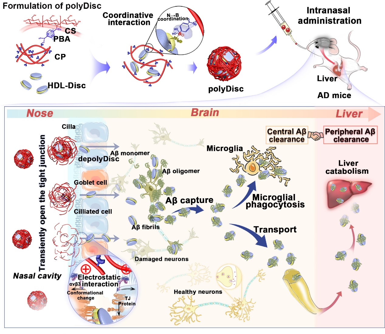 近年,F(xiàn)DA連續(xù)獲批Aducanumab和Lecanemab兩種Aβ抗體藥物用于阿爾茨海默癥(AD)早期治療,說明Aβ清除與臨床收益存在量效關(guān)系,但其應(yīng)用仍受限于Aβ中樞清除效率不足和腦出血/水腫等不良反應(yīng)。基于現(xiàn)有Aβ中樞清除策略的應(yīng)用局限,受天然盤狀高密度脂蛋白(HDL-Disc)的Aβ高效運(yùn)載活力及腦內(nèi)外轉(zhuǎn)運(yùn)通路啟發(fā),本研究開發(fā)了一種“Aβ類抗體”藥物HDL-Disc,為繞過血腦屏障和提高腦內(nèi)藥物暴露量,合成了糖基促滲聚合物定向組裝HDL-Disc,共建聚合型HDL-Disc(polyDisc)。經(jīng)鼻給藥后,polyDisc響應(yīng)鼻腔弱酸性微環(huán)境解聚,糖基促滲劑可逆開啟鼻腔黏膜屏障,加速釋放HDL-Disc滲透入腦;入腦后,HDL-Disc“類抗體”親和捕獲Aβ,既能靶向小膠質(zhì)細(xì)胞完成高效中樞清除,又能通過淋巴外排入血富集于肝臟增效外周清除,實(shí)現(xiàn)中樞協(xié)同外周的Aβ高效代謝。