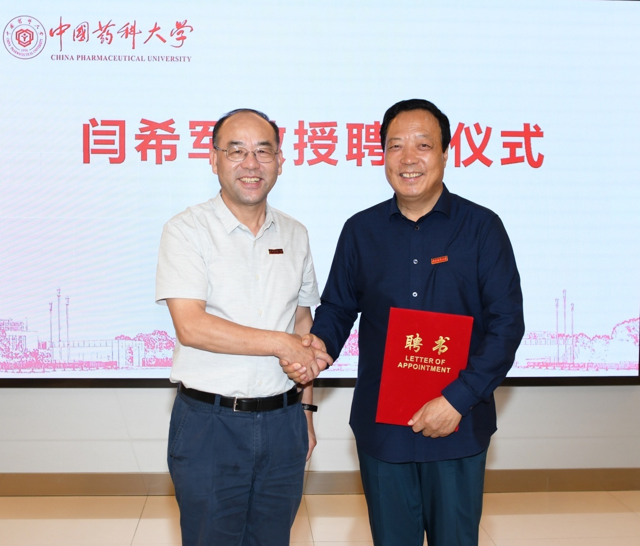 在與會人員的共同見證下,閆凱境執行主席和郝海平副校長共同為“中國藥科大學-天士力創新藥物研究院”揭牌;郝海平副校長宣讀《關于聘任閆希軍為中國藥科大學客座教授的決定》;來茂德校長為閆希軍主席頒發聘書并為其佩戴中國藥科大學校徽。
